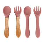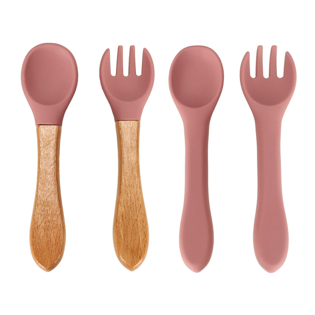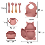 Silikona trauku komplekts ir ideāls veids, kā dažādot maltītes un mudināt bērnus ēst. Silikona bļodiņai un šķīvim ir piesūcekņi , kas neļauj tiem apgāzties bērna kustību laikā. Krūzei ir divi ergonomiski rokturi, kas lieliski piemēroti mazām rociņām. Krūzītei ir divi vāciņi: viens ar dzeramo salmiņu un otrs ar slēdzamu vāku, kas pasargās uzkodas no izšļakstīšanās. Komplektā ietilpst arī divi galda piederumu komplekti, viens pilnībā no silikona un otrs no silikona + koka. Praktisks priekšauts ar kabatu ēdienam, kas krīt, pasargās jūsu bērna drēbes no netīrības. Visi komplekta elementi ir izgatavoti no augstas kvalitātes silikona tumši rozā krāsā. Katrs trauks ir viegli tīrāms un mazgājams trauku mazgājamajā mašīnā.