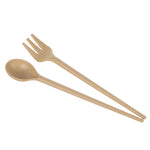 Komplektā galda piederumi: ērtas un izturīgas karote un dakša no kviešu salmiem, dakšas viļņotā mala kalpo arī par nazi; piederumi viegli salokāmi un ietilpst kastītē.