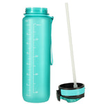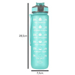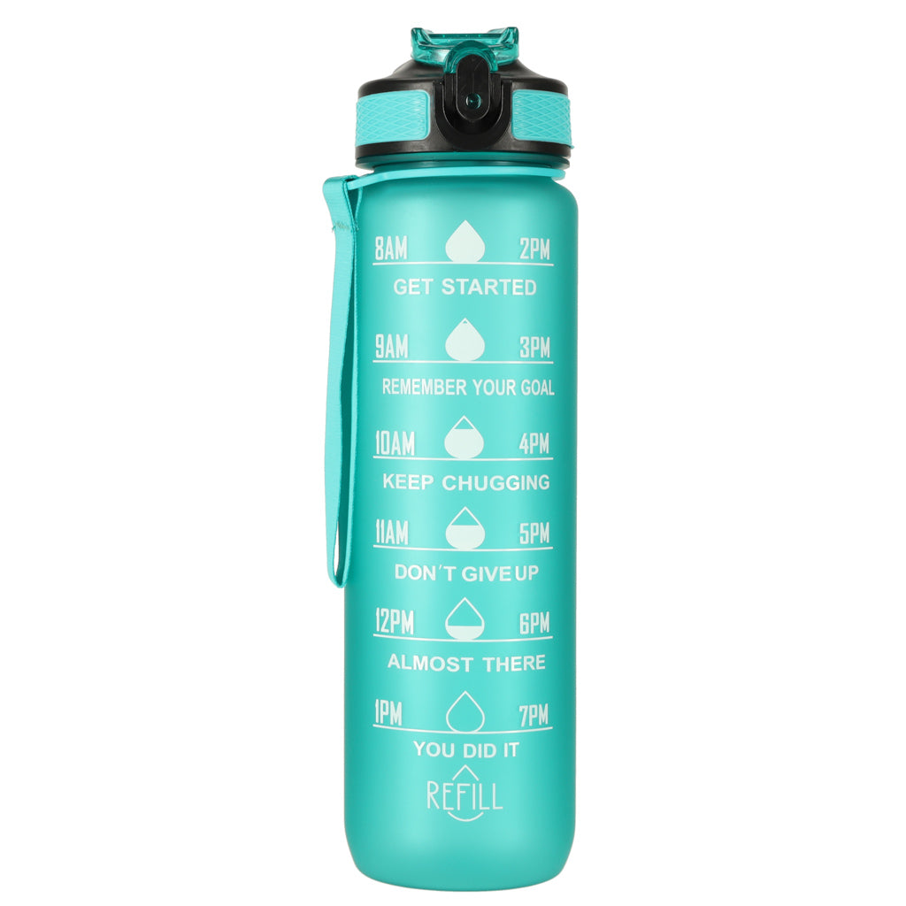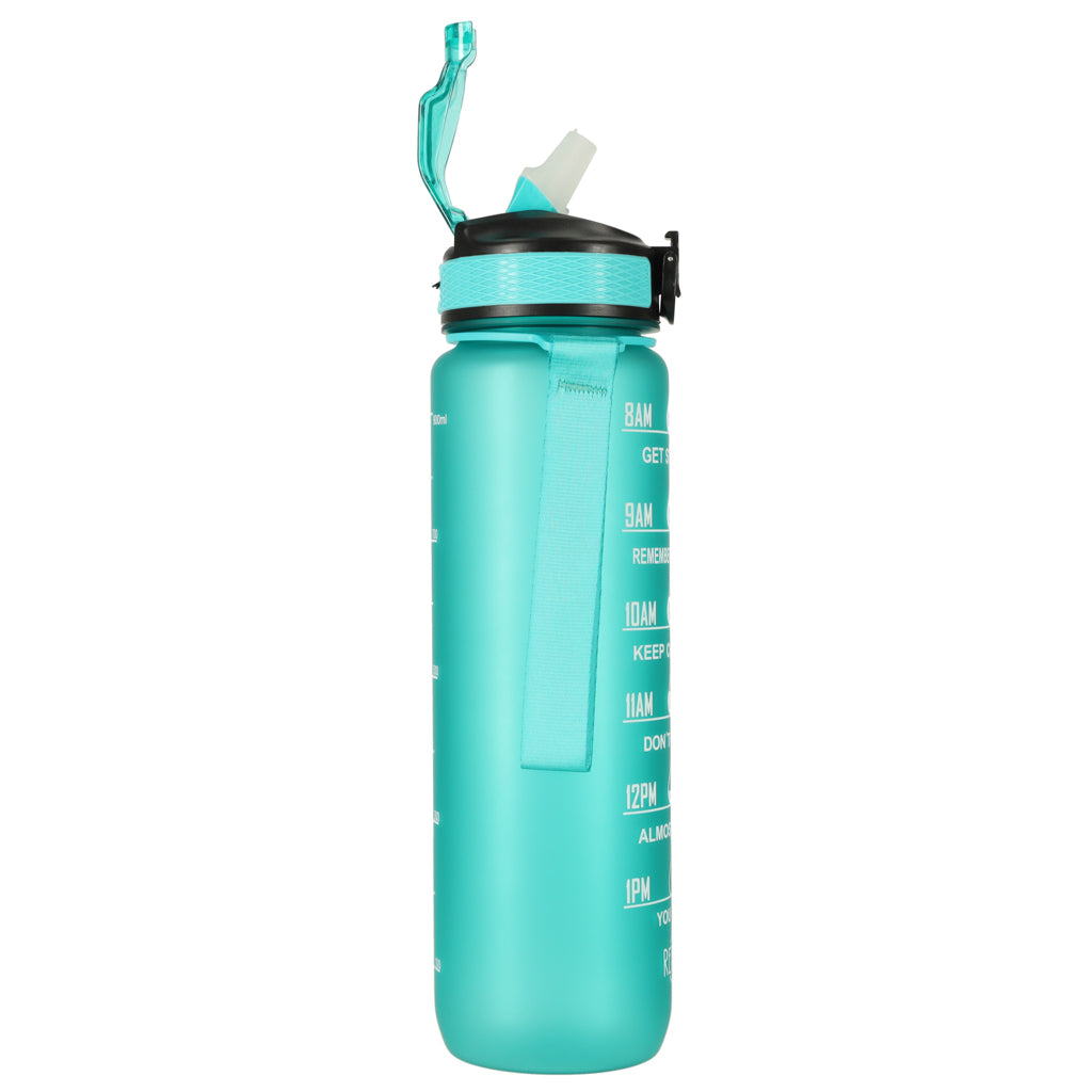 Tritāna ūdens pudele – ideāli piemērota katrai dienai! Tā ietilpība ir 1 litrs – divi pildījumi atbilst ikdienas ūdens nepieciešamībai. Tam ir skala ar stundām un motivējošiem saukļiem, kas atgādina regulāri dzert ūdeni. Aprīkots ar salmiņu ar snīpi, lai ērti iedzertu iecienītos dzērienus. Drošības tapa aizsargā pudeli pret nejaušu atvēršanu. Auduma lente ļauj ērti paņemt pudeli līdzi jebkur. Pateicoties tritāna izmantošanai, pudele ir izturīga pret bojājumiem .