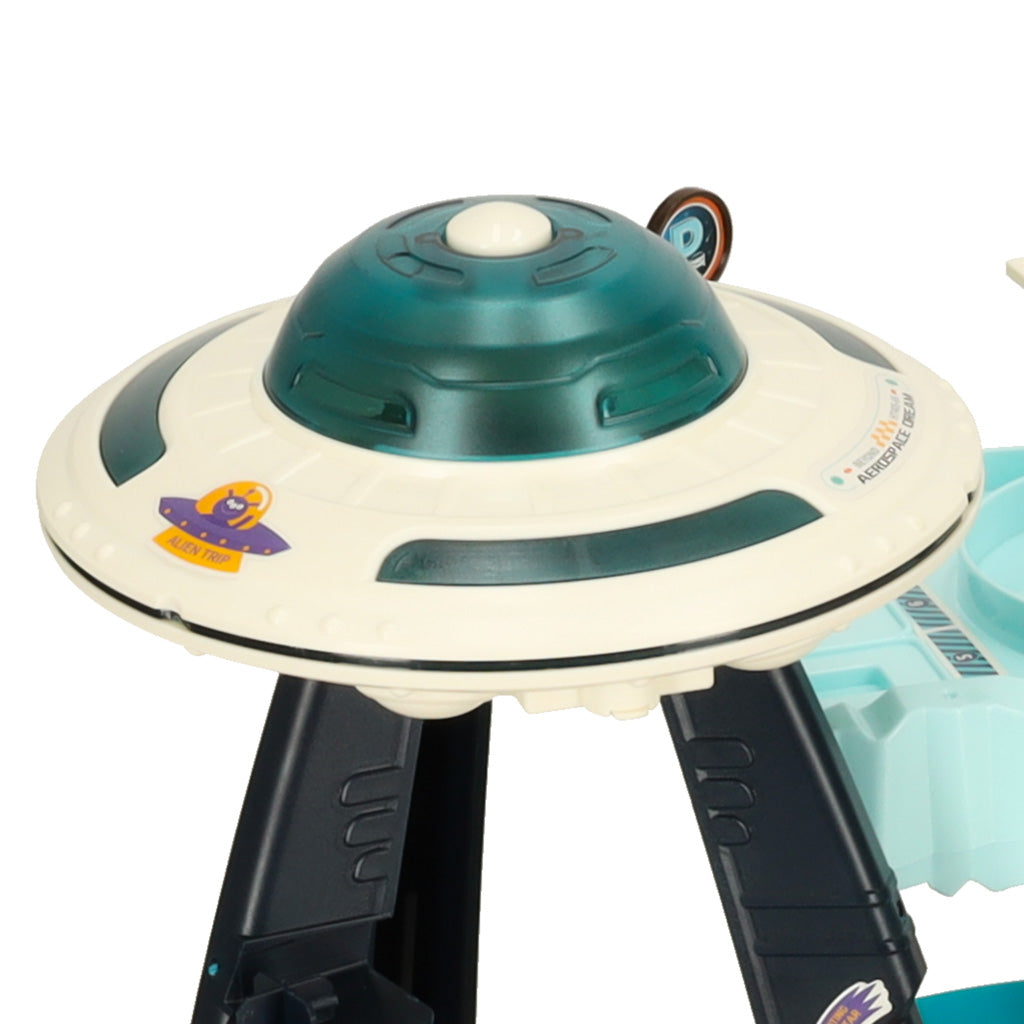 Centrā atrodas futuristiska UFO torņa ierīce, kas darbojas uz 3 LR44 baterijām (iekļautas komplektācijā), radot gaismas un kosmiskas skaņas efektus, kas stimulē sajūtu attīstību un padara rotaļu vēl aizraujošāku.
