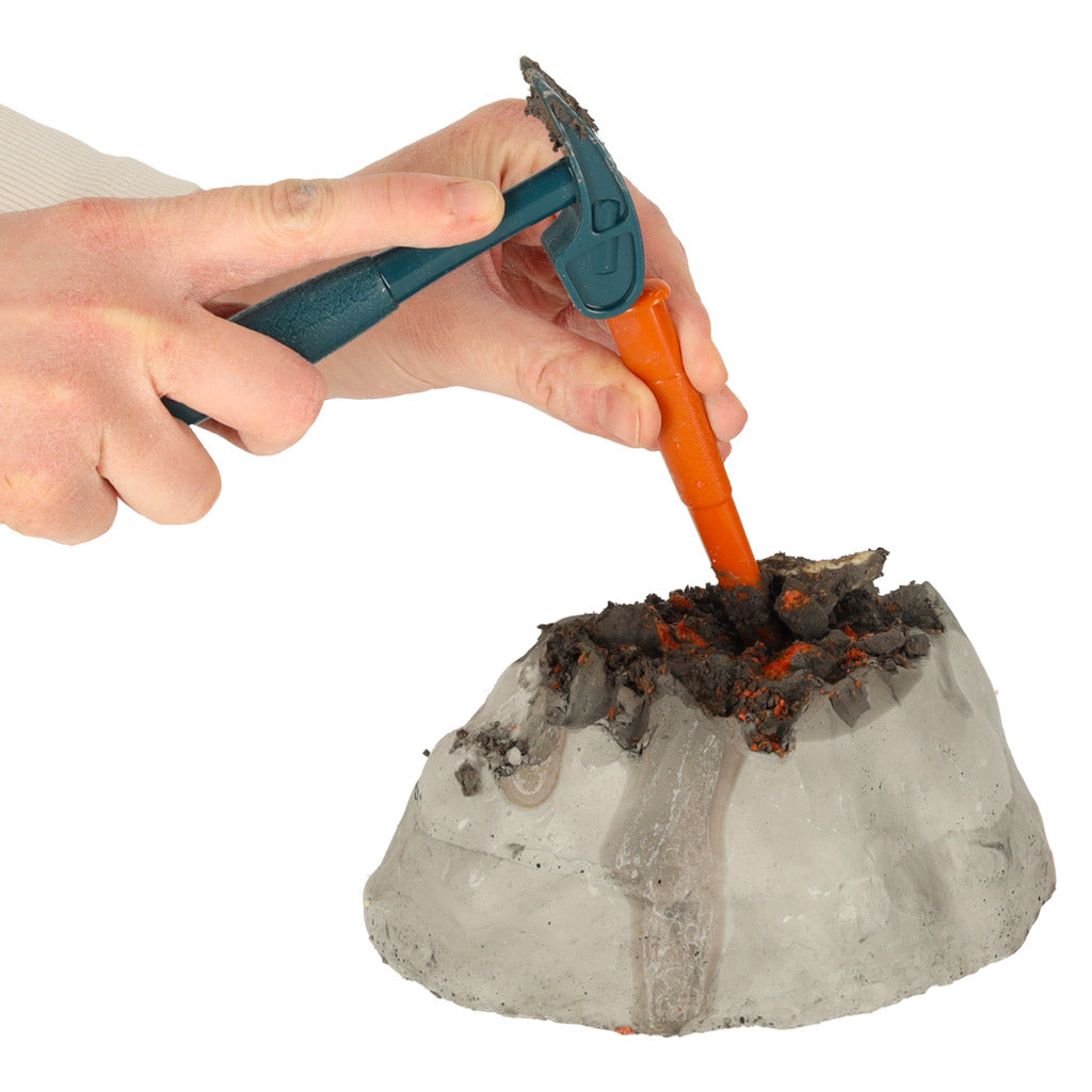 Komplektā ir vulkāna modelis, kurā paslēpta dinozaura fosilija. Bērns var veikt “izrakumus”, izmantojot komplektā esošos darbarīkus – kaltu un āmuriņu – lai atklātu dinozaura skeleta figūru. Papildus tam iespējams veikt vulkāna izvirduma eksperimentu, kas bērniem parāda ķīmisko reakciju norisi un izskatās iespaidīgi.