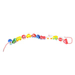 Krāsainie koka kluči ļauj apgūt formas, krāsas un simetriju, bet vērtēšana uz virtenes trenē pacietību un precizitāti.
