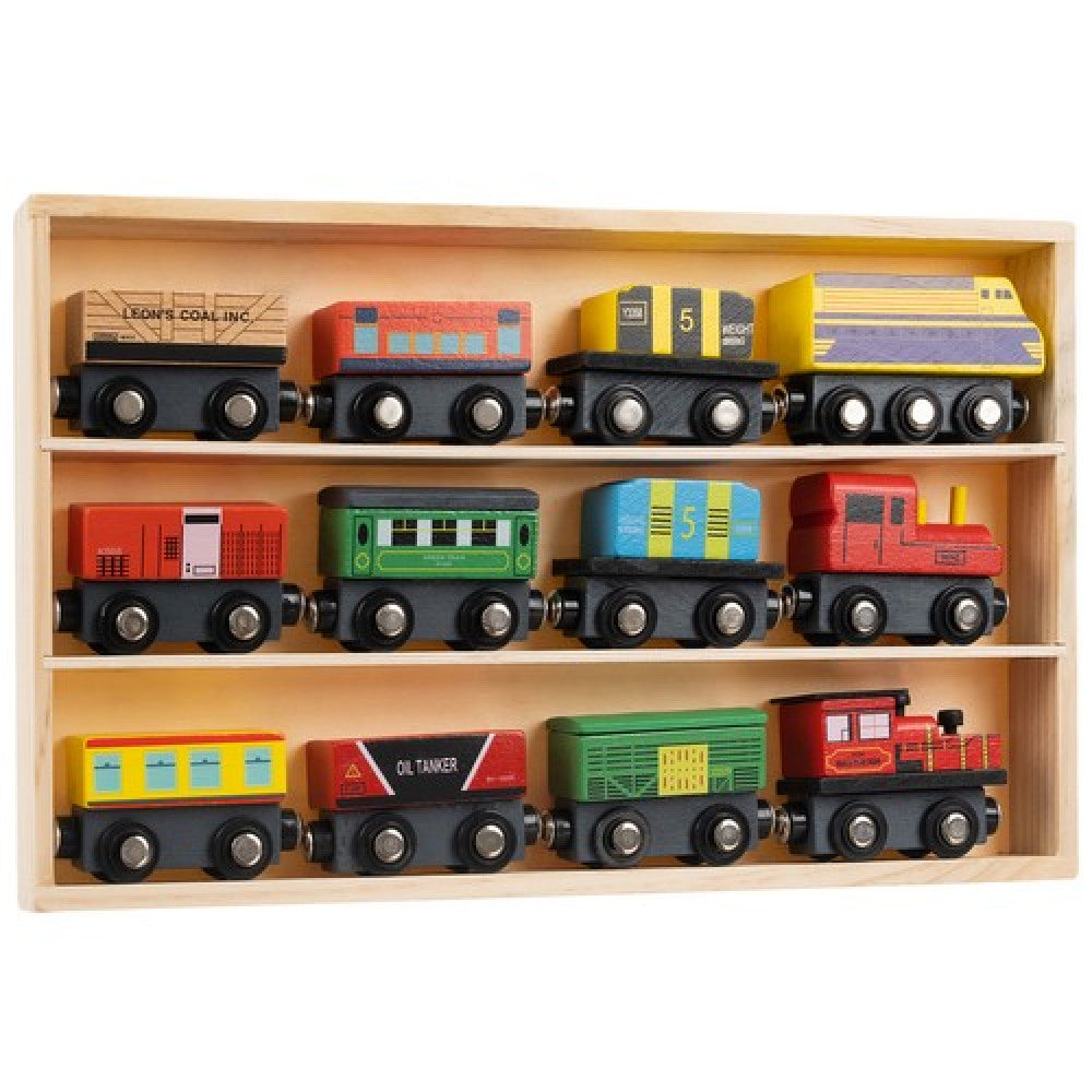 Koka vilcieniņš, 9 vagoni un 3 lokomotīves, koka kastē