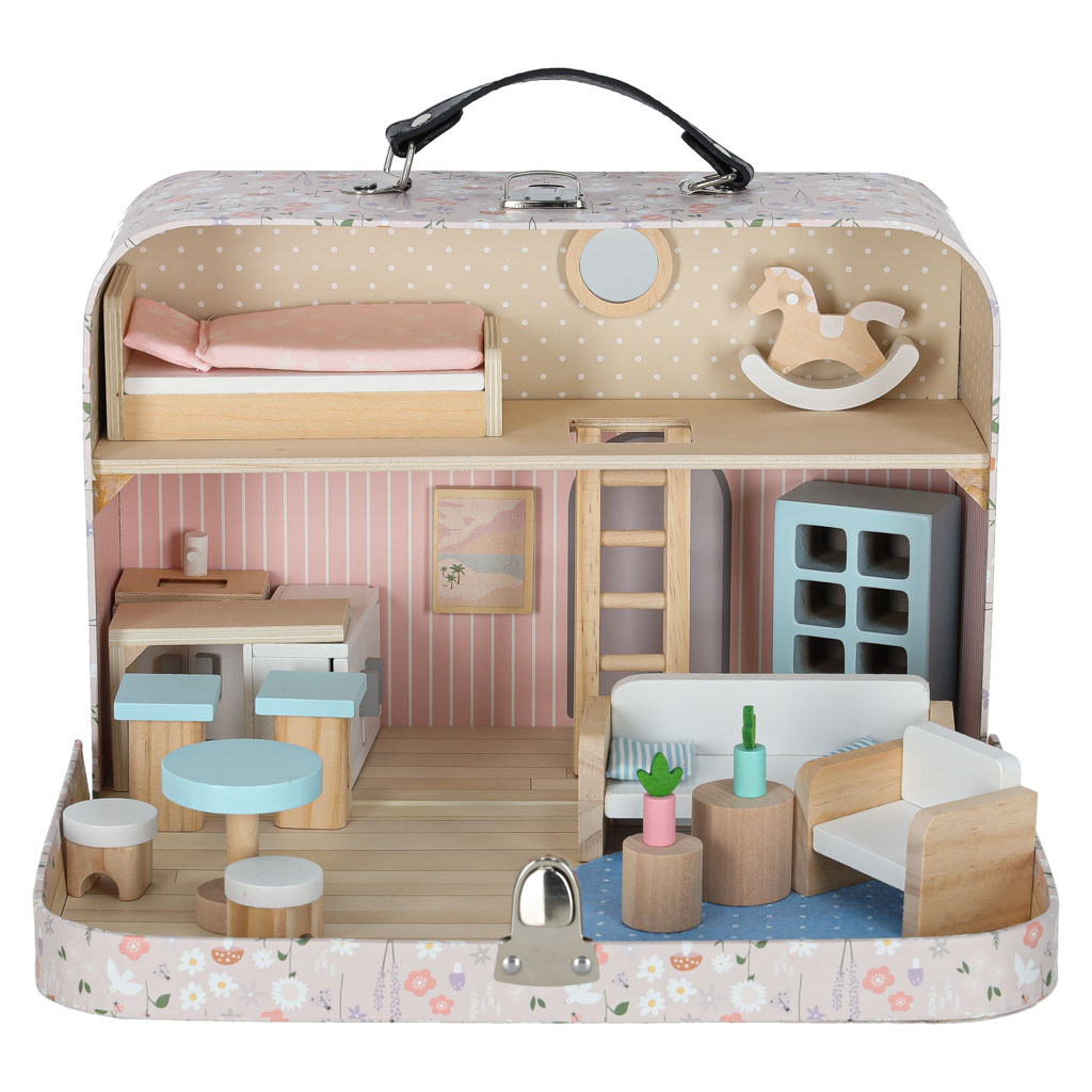 Ekskluzīva leļļu māja čemodānā ar daudzveidīgu koka un auduma mēbeļu komplektu – īsts prieks gan mazajiem, gan vecākiem! Aiz čemodāna izskata slēpjas divstāvu leļļu dzīvoklis, ko var iekārtot pēc savas gaumes, izvietojot mēbeles gan mājiņas iekšpusē, gan uz čemodāna atloka. Kad spēlēšanās beigusies – visus priekšmetus var ērti salikt atpakaļ čemodānā, veicinot kārtības prasmes.