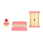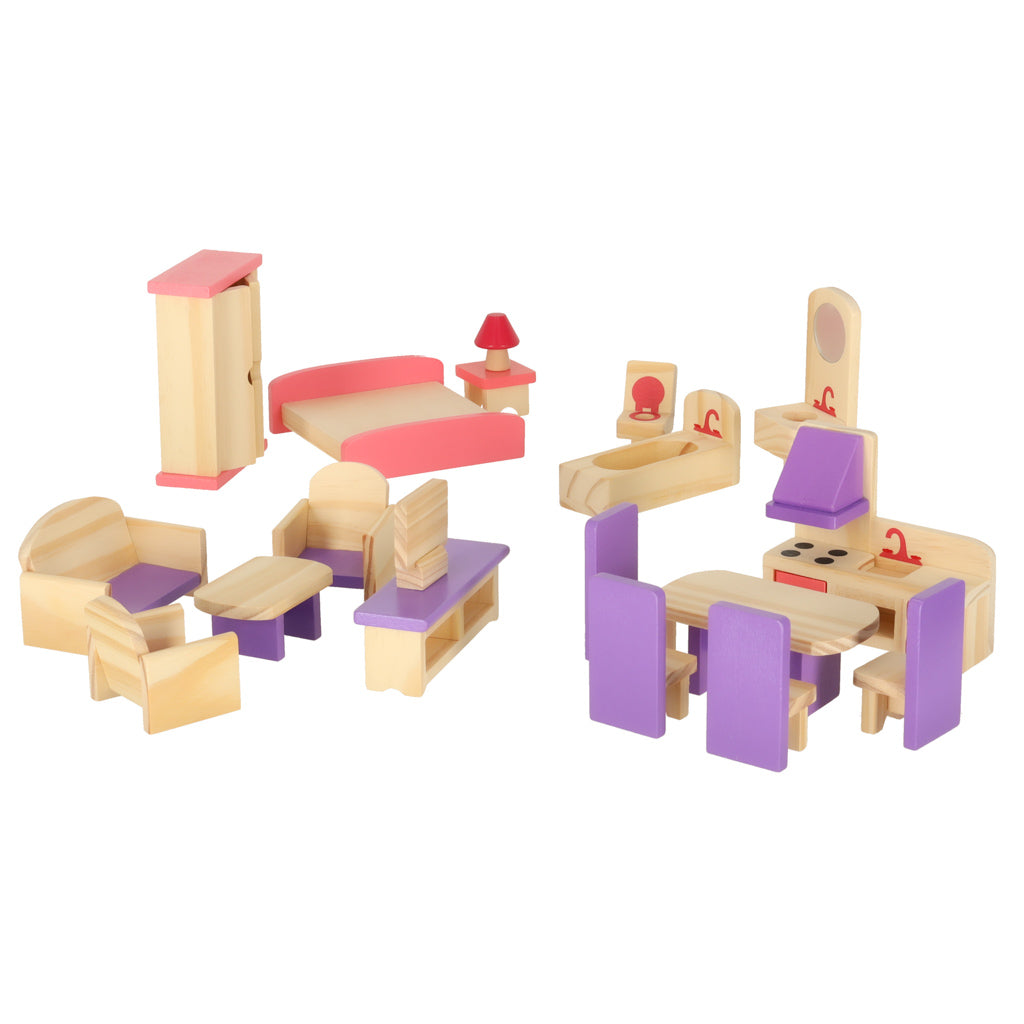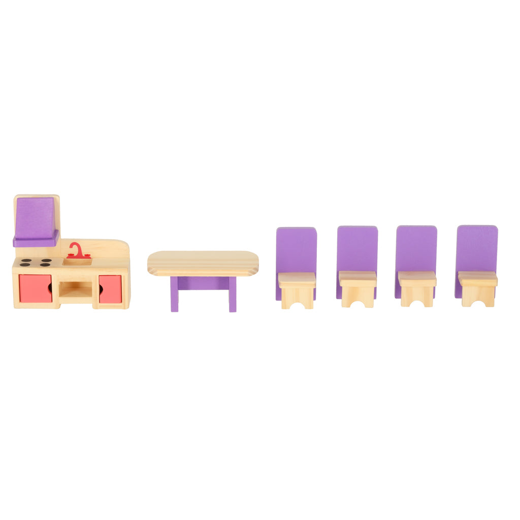 Leļļu namiņu papildina koka mēbeļu komplekts . Komplektā ietilpst viesistabas, guļamistabas, vannas istabas un virtuves iekārtojuma elementi , kas rada reālistisku un funkcionālu interjeru lellēm. Mēbeles ir izgatavotas no gludi slīpēta koka un krāsotas ar drošām, izturīgām purpursarkanām un rozā krāsām. Komplekts atbalsta bērnu telpiskās iztēles un radošuma attīstību .