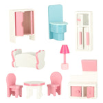 Komplektā ir dažādas mēbeles: virtuves iekārta, lampiņa, gultiņa, divi krēsli, galds, tualete, skapis un kumode.