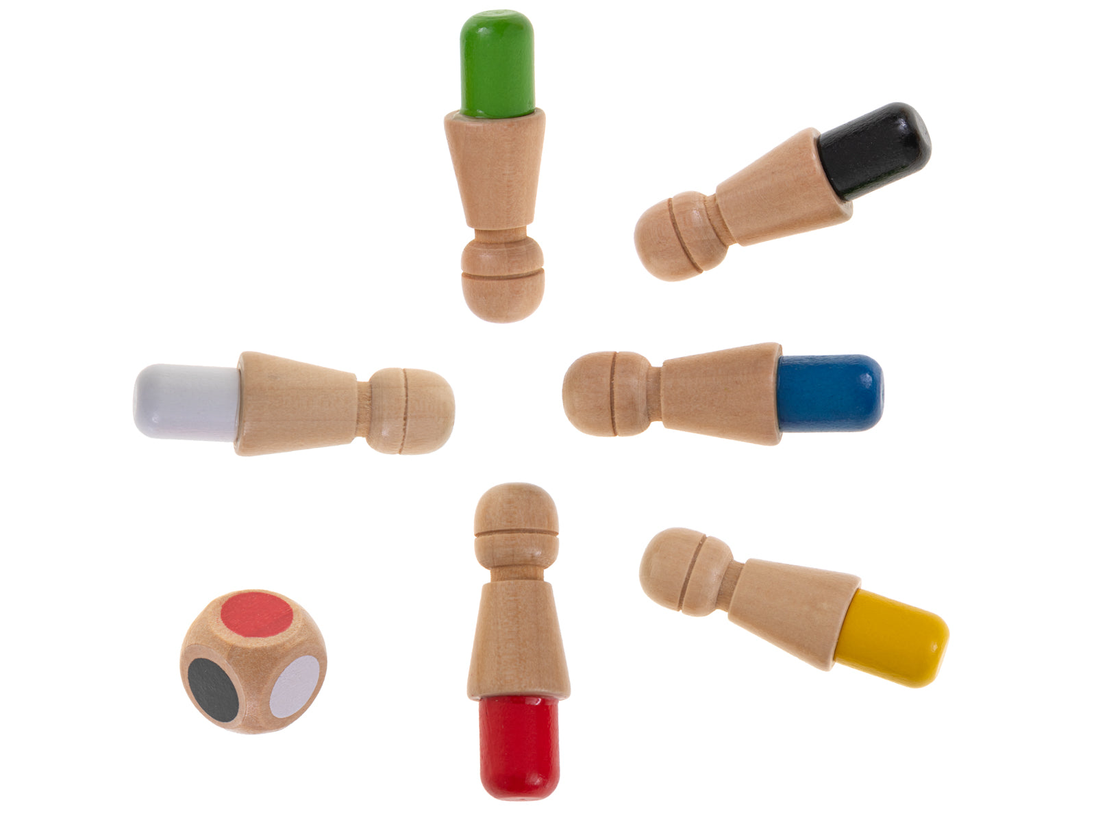 5. Ir 4 krāsas figūriņas. Ja uzmet krāsu, kuras figūriņas vairs neatrodas uz plāksnes, met kauliņu vēlreiz.