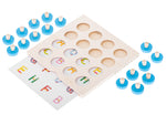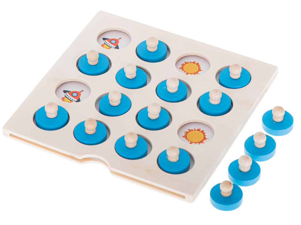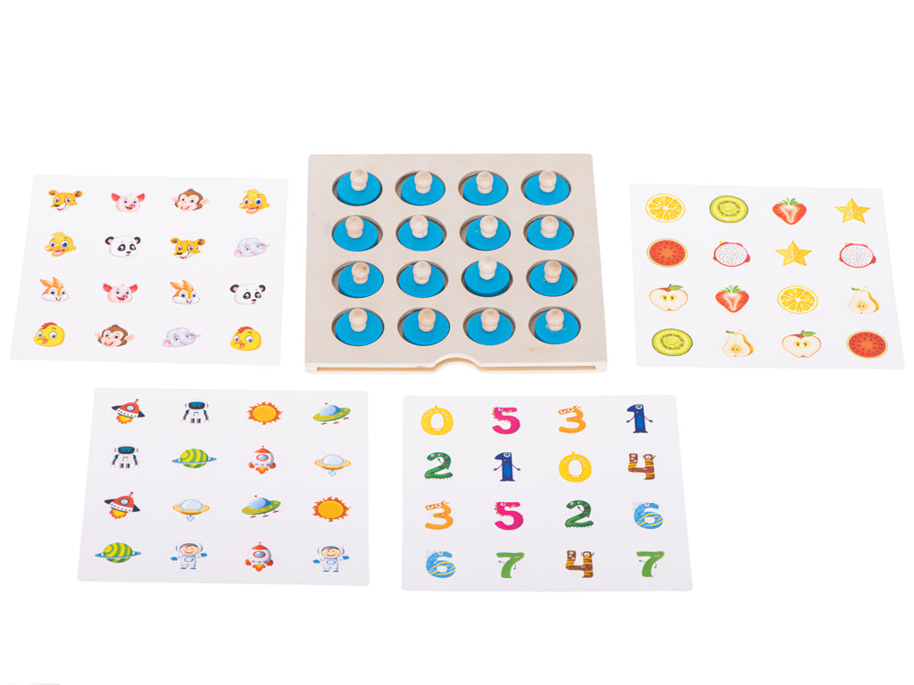Šī spēle ir lielisks veids, kā bērniem attīstīt uzmanību, atmiņu un domāšanu, vienlaikus pavadot laiku jautri un lietderīgi. Spēles pamatnē ievieto izvēlēto attēlu kartīti un to pārklāj ar koka ripiņām. Bērnam jāatceras, kur atrodas noteiktie attēli, un jāmēģina atrast vienādus pārus, paceļot ripiņas.