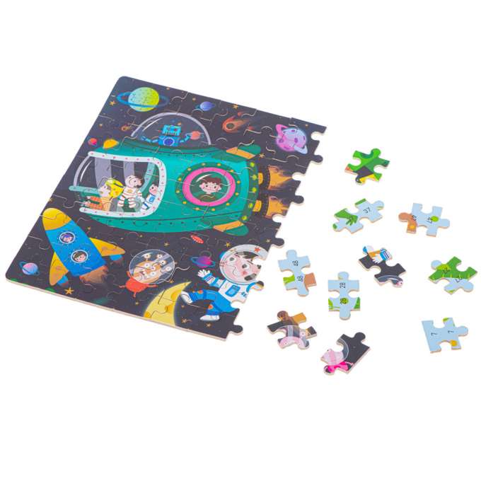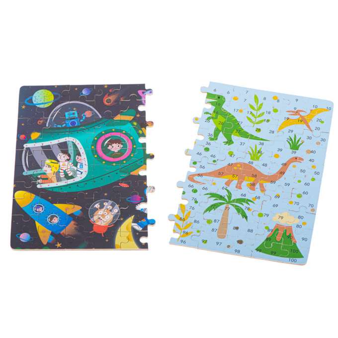 Lai jautrība būtu vienkāršāka un daudzveidīgāka, katram elementam abās pusēs ir attēls! Vienā no tiem redzams krāsains kosmosa zīmējums, bet aizmugurē ir dinozauri un cipari, kas atvieglo puzles salikšanu!