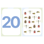 20 skaitļu kartītes – vienā pusē skaitlis (1–20), otrā – ilustrācija ar attiecīgo objektu skaitu