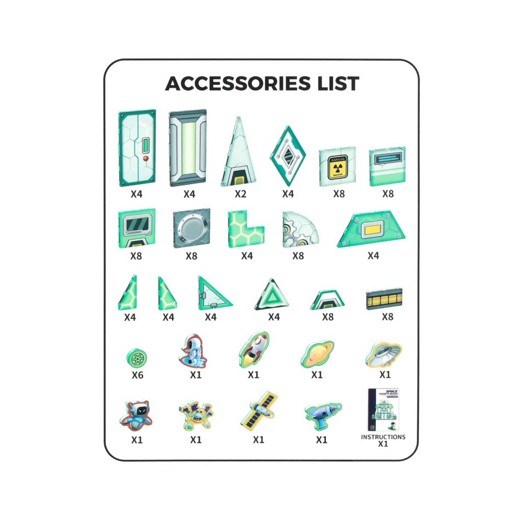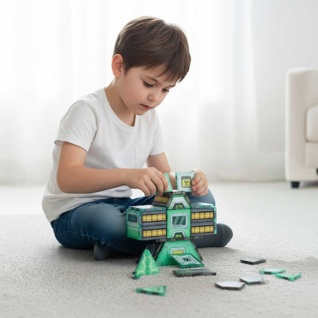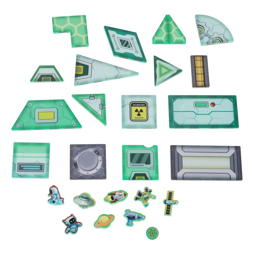 Magnētiskais konstruktors kosmosa tematikā, kas apvieno būvēšanu, fantāzijas stāstus un STEM mācīšanos vienā rotaļlietā. Dažādu formu klucīši savstarpēji savienojas ar magnētiem, ļaujot bērnam veidot gan vienkāršas, gan sarežģītākas telpiskas konstrukcijas – kosmosa bāzes, raķetes, robotus un citus izdomātus varoņus.