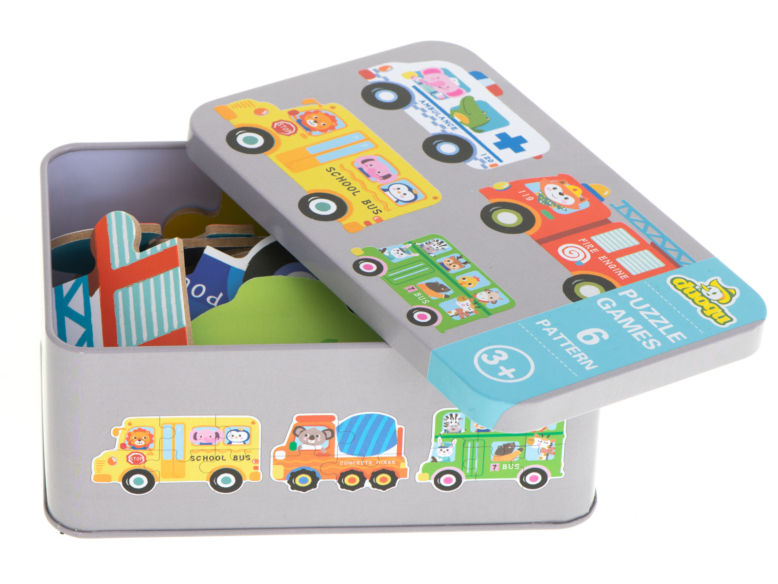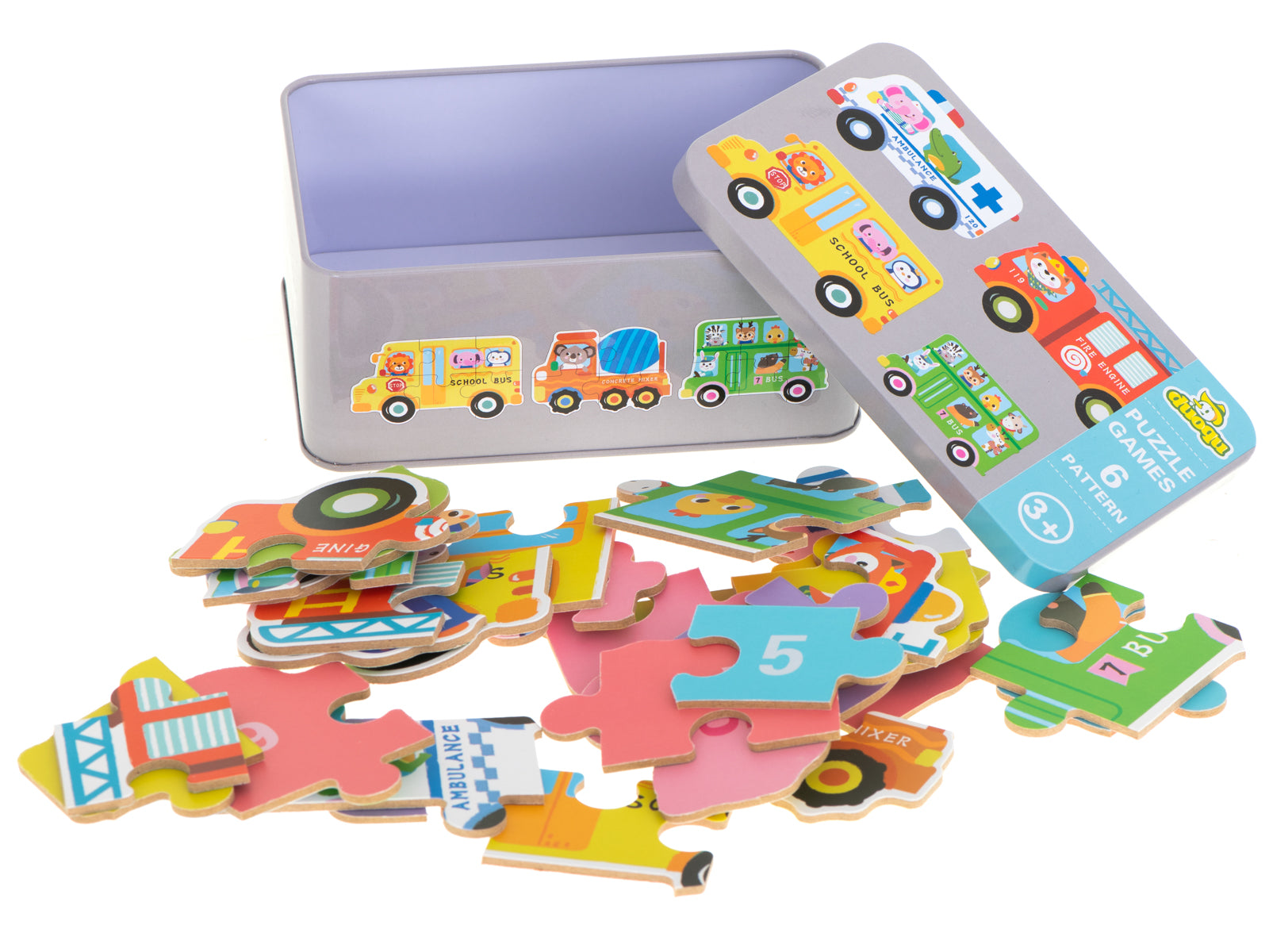 Puzle metāla kārbā, 6 transportlīdzekļi, katrs no 3-6 gabaliņiem