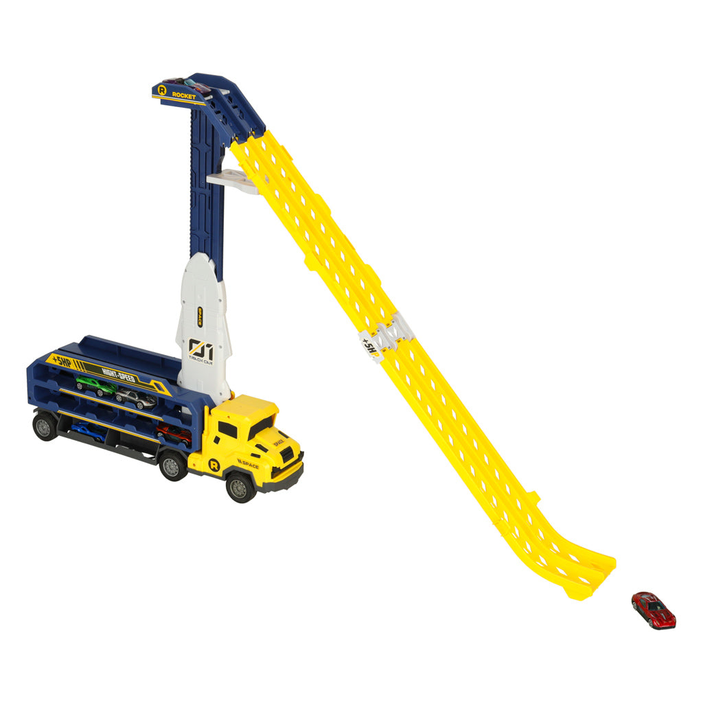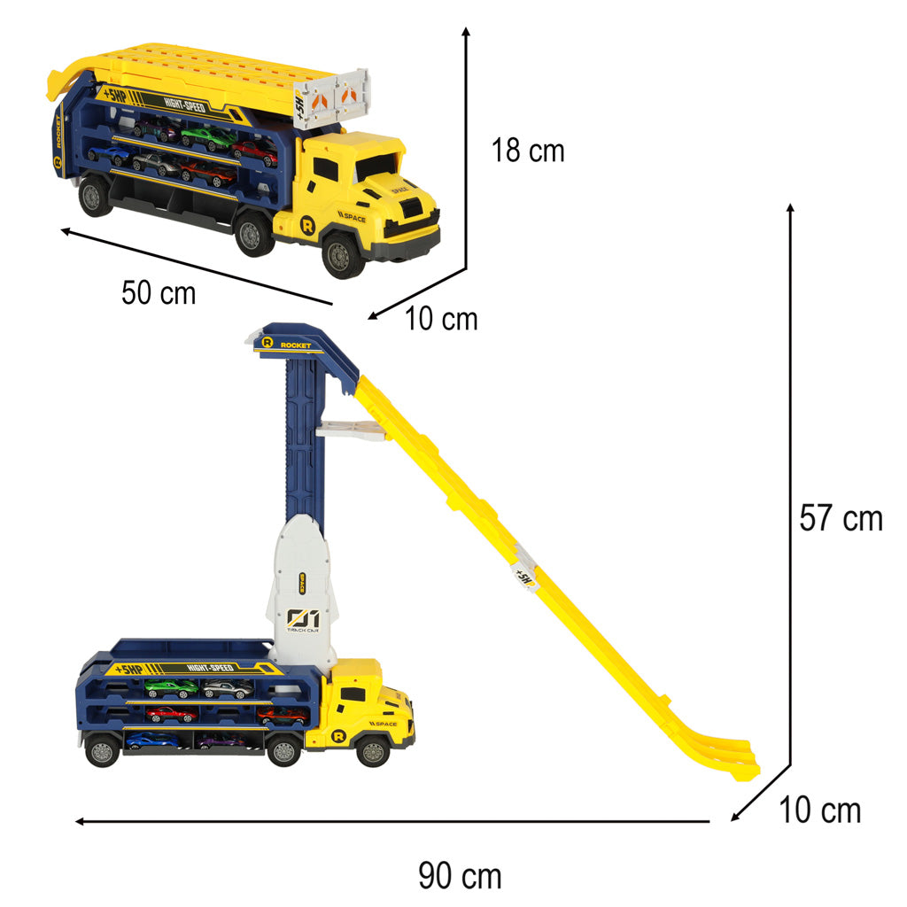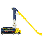 Dzeltenais un zilais evakuators , kas pārvēršas par sacīkšu trasi, ir lieliska ideja mazajiem automobiļu cienītājiem. Daudzfunkcionālais evakuators ar izmēriem 50x10x18 cm pārvadā sešas mazas automašīnas . Tas pārvēršas par trašu sacīkšu trasi ar 57 cm augstumu, kur automašīnas var sacensties viena pret otru. Rotaļlieta atbalsta smalko motoriku un roku-acu koordinācijas attīstību bērniem.