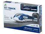 Priekšējā lokomotīve ar motoru (darbojas ar 2 AAA baterijām - nav iekļautas. Lai ievietotu baterijas, atskrūvējiet skrūvi, kas tur transportlīdzekļa apakšējo, balto daļu). Lokomotīve iedarbina, nospiežot balto taisnstūra pogu transportlīdzekļa augšpusē.