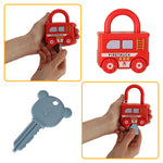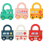 Atslēdzamas slēdzenes. Katrai slēdzenei ir sava atslēdziņa. Bērnam jāpiemeklē atslēdziņa, jāatrod pareizais virziens atslēgas ievietošanai, jāpagriež tā un slēdzene atveras!