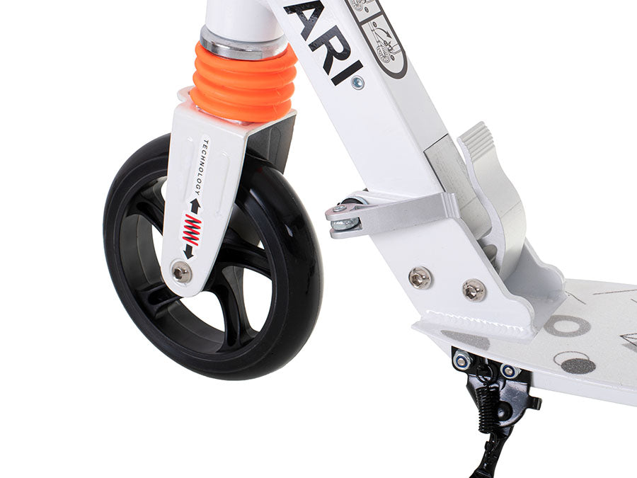 CARI skrejritenim ir 3 pakāpju ātruma regulēšana un sistēma, kas ļauj to ātri salocīt. Viss, kas jums jādara, ir jāatlaiž fiksators, kas atrodas savienojuma vietā ar platformu. Šī ir ārkārtīgi noderīga funkcija, ja nepieciešams ātri salocīt skrejriteni, piemēram, kad bērns steidzas uz autobusu.