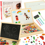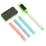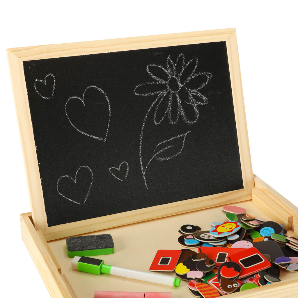 Kompakta kaste ar divu veidu tāfelēm, magnētiskām detaļām, krītiņiem, flomasteriem, tīrīšanas sūklīti.