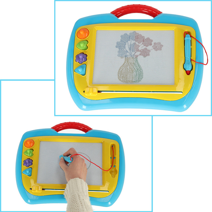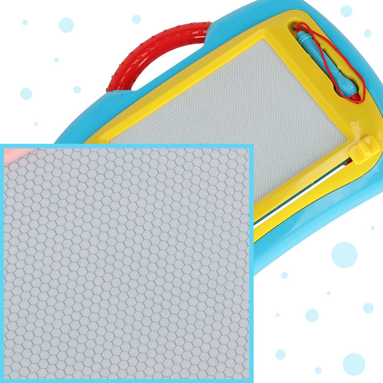 Tāfele uz kuras var zīmēt gan ar magnētisko irbuli, gan ar ģeometriskajām magnētiskām formiņām. Visu viegli nodzēš ar speciālo pogu.