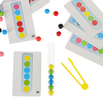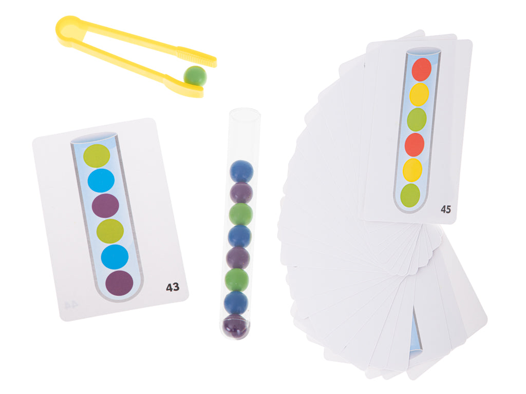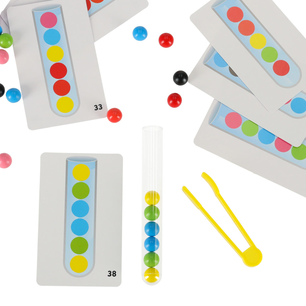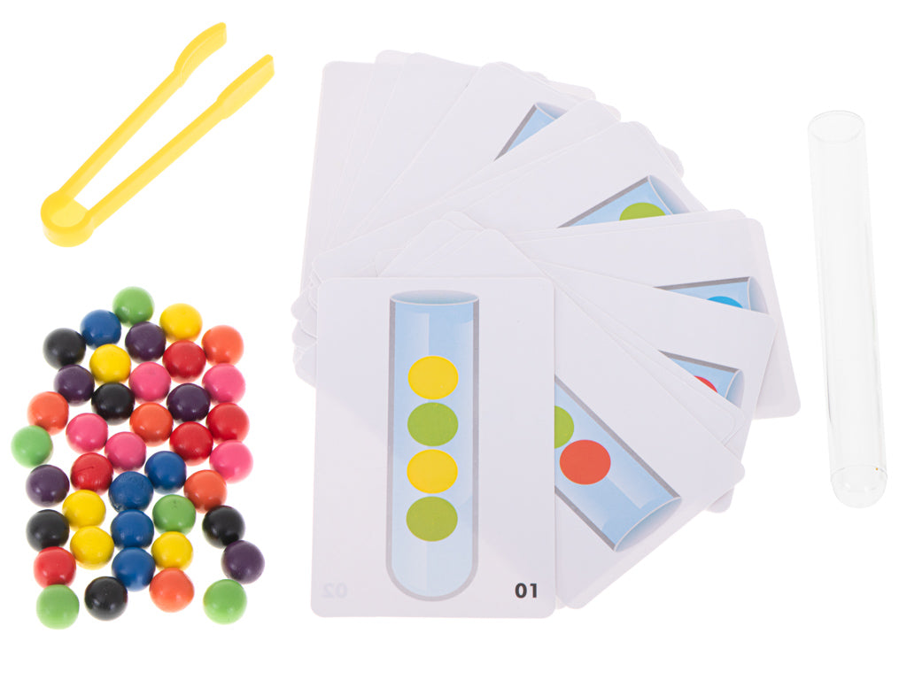 Spēlē ir krāsainas bumbiņas un kartītes ar paraugiem, kuros attēloti dažādi salikumi. Bērna uzdevums ir ar knaiblēm vai ar rokām ievietot bumbiņas mēģenē pareizajā secībā, atbilstoši izvēlētajai kartītei.